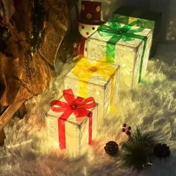 Show moreLight up your holidays with our **2024 Upgraded Light Up Christmas Decorations Outdoor**! This enchanting set of three Christmas gift boxes brings magic to your home with its stunning design and bright illumination. Each box is crafted in varying sizes to add dimension and charm, featuring large (7.9 x 7.9 x 7.9 inches), medium (5.9 x 5.9 x 5.9 inches), and small (4.7 x 4.7 x 4.7 inches) options, ensuring a delightful display that captures the spirit of the season. The warm white LED lights, embedded in these PVC shell boxes, create a beautiful glow that radiates a cozy ambiance, making them perfect for placement near your Christmas tree or anywhere in your yard.
