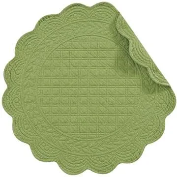 Show moreElevate your dining experience with our exquisite Set of 4 PCS, 17" Round Quilted Placemats in vibrant green. Featuring a delightful quilted design, these placemats not only protect your table but also add a touch of sophistication to any meal. Each mat, measuring approximately 17" in diameter, is crafted from 100% cotton, ensuring durability and softness, superbly combining function and elegance. Ideal for both casual and formal settings, these placemats can seamlessly transition from everyday meals to festive gatherings, making them a versatile addition to your home.