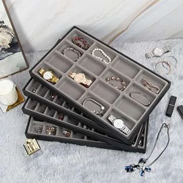 Show more Discover the ultimate solution for jewelry organization with this exquisite set of jewelry trays. Meticulously crafted from premium synthetic black leather and featuring elegant grey inserts, these trays not only ensure your cherished pieces remain safe and secure but also offer a stunning display for your jewelry collection. Each tray comes with a thoughtfully designed compartment arrangement, including 40, 11, 21, and 16 sections, allowing you to keep your necklaces, earrings, bracelets, rings, brooches, and watches easily accessible and beautifully presented.