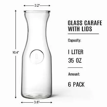 Show moreTransform your beverage serving with our exquisite Set of 6 Glass Carafes with Lids, designed to blend elegance and functionality. Each carafe boasts a capacity of 1 liter, making it perfect for any occasion, from casual brunches to formal wedding receptions. Created from high-quality, durable glass, they are an essential addition to your kitchen, ensuring your favorite drinks are served in style. Moreover, their clear design not only enhances the aesthetic appeal but ensures that the flavors of your beverages remain pure, letting the delightful colors shine.