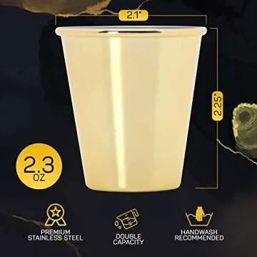 Show more Introducing the exquisite Set of 6 Gold Stainless Steel Shot Glasses, perfect for those looking to add a touch of glamour and sophistication to their drinking experience. Each of these beautifully crafted shot glasses features a luxurious gold finish that not only enhances their classic design but also brings a modern charm to any bar, countertop, or celebration. Whether you’re toasting to a special occasion or simply enjoying your favorite beverages, these 2 oz stainless steel shot glasses ensure that every sip is an elegant affair.