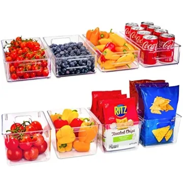 Show more Introducing the Set of 8 Refrigerator Pantry Organizer Bins — a versatile and essential solution for maintaining an organized home. This set consists of 4 larger bins (11" L x 8" W x 6" H) and 4 smaller bins (10" L x 6" W x 3" H) designed to make your life simpler, whether you’re restocking your fridge, organizing your pantry, or decluttering your craft room. Made from 100% food-safe BPA-free plastic, these shatter-resistant containers offer both durability and practicality. The clear design ensures that you can see exactly what’s inside at a glance.