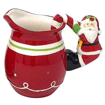 Show moreTransform your holiday gatherings with the enchanting Set of Sugar & Creamer Server featuring the festive Ceramic Santa design. This delightful kitchen decor piece is not just functional; it is the perfect blend of holiday spirit and elegance. Crafted from high-quality ceramic, it showcases a charming Santa with vibrant red, white, and green hues, making it a cheerful addition to your Christmas table setting. The set comes complete with a matching spoon, ensuring you have everything you need to serve your favorite sweeteners in style. Whether you're pouring cream into coffee or adding sugar to tea, this set brings a touch of magic to your holiday traditions.