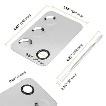 Show moreStep into the world of beauty and craftsmanship with the SEUNMUK 6 Pack 6 x 4 Inch Stainless Steel Cosmetic Palette. Crafted from high-quality thick stainless steel, these cosmetic palettes are designed to meet the demands of professionals and enthusiasts alike. Each tray features a comfortable silicone ring surrounding the thumb hole, allowing for optimal grip and ease of use. Whether you are blending foundation, mixing pigments, or experimenting with nail art, these palettes provide a sturdy and reliable platform for all your beauty needs.