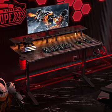 Show more Transform your gaming experience with the SEVEN WARRIOR 60" Modern Gaming Desk, designed to cater to the needs of every serious gamer while seamlessly transitioning into an ergonomic office space. This desk features a striking carbon fiber surface that not only enhances the aesthetic appeal of your setup but also provides a durable and functional workspace. With dimensions of 23.6"D x 60"W x 29.1"H, it offers ample space for your gaming equipment and more. The built-in power center featuring 4 outlets and 2 USB ports keeps your devices charged and within reach, ensuring you stay connected and ready for action.