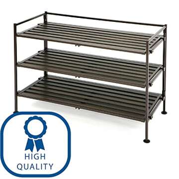 Seville Classics Sturdy Freestanding Storage Shelf for Bedroom, Closet, Entryway, Dorm Room Organizer, Stackable Durable Metal Shoe Rack, Espresso Slat, 3-Tier