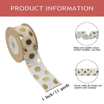 Show more Introducing the Sewhick 1 Inch Polka Dot Ribbon, a perfect blend of elegance and versatility, designed to elevate your creative projects. This stunning ribbon features a chic gold polka dot design printed on luxurious chiffon fabric, available in a generous length of 11 yards, securing more than enough material for various decorative needs. The ribbon is beautifully wrapped around a convenient plastic spool, ensuring that it remains tangle-free and ready for immediate use. Whether you’re wrapping gifts for loved ones or crafting beautiful decorations for any occasion, this ribbon is your go-to accessory.
