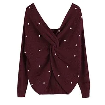Sexyshine Women's V Neck Criss Cross Backless Pearl Long Batwing Sleeve Loose Knitted Sweater Pullovers,Wine