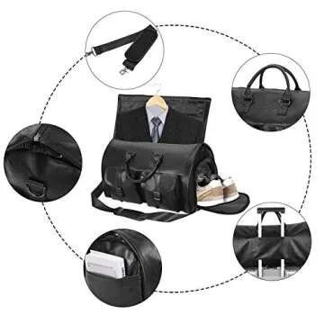 Show more Experience travel like never before with this sophisticated and versatile garment duffel bag that effortlessly combines functionality with stylish design. This traveling garment bag is perfect for those who want to keep their attire wrinkle-free while on the go. With dimensions measuring 39”L x 21.5”W, it meets airport carry-on requirements, allowing you to breeze through security without hassle. Crafted from premium waterproof PU leather, this bag not only looks exquisite but also offers durability and resilience against the elements.