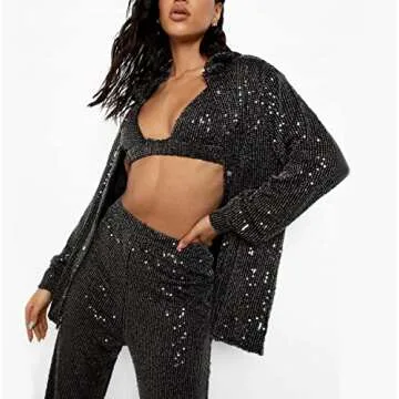 Seyumixi Women Sparkle Outfits Sequin Pants Elastic Waist Wide Leg Trousers Glitter Shiny Pants Bling Party Clubwear(Black Pants,S)