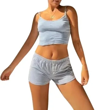 Show moreIntroducing the Seyurigaoka Women Y2k 2 Piece Lace Shorts Set – your new summer essential! This adorable set features a stylish sleeveless v-neck cami top paired with high-waisted shorts, all designed with chic striped blue fabric. Made from a high-quality cotton blend, this sleepwear is not only breathable and lightweight but also incredibly soft and skin-friendly, making it perfect for year-round wear from spring through winter. The sheer lace accents and heart print add a touch of femininity and playfulness, elevating your loungewear game to new heights. Experience ultimate comfort with this sexy yet relaxed design that fits beautifully, complementing your body while providing the perfect amount of coverage.