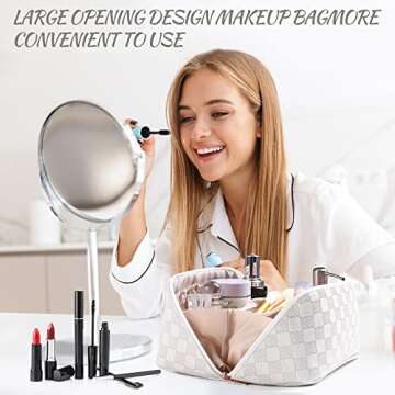 Show more Introducing the SFXULIX Large Capacity Travel Cosmetic Bag – your ultimate travel companion for all things beauty! Crafted with high-quality PU leather, this cosmetic bag not only exudes elegance with its chic bone color, but it’s also waterproof, making it ideal for safeguarding your makeup essentials during your journeys. Designed for functionality and style, this portable travel makeup bag features a sturdy handle, allowing you to carry it effortlessly wherever you go. The spacious interior is well-organized with multiple compartments, providing ample space for your makeup, skincare items, and toiletries while keeping everything neatly in place.