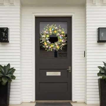 Show moreTransform your home this season with the stunning Sggvecsy 20 Inch Easter Wreath, a beautifully crafted addition to your spring decor. Made from high-quality silk and foam, this exquisite wreath showcases a vibrant blend of faux eucalyptus leaves, colorful daisies, and cheerful clusters of berries. With an enchanting design that symbolizes rebirth through the included decorative eggs, it brings a fresh and lively touch to any space. Perfectly suited for any door, wall, or window, this wreath will make a bold statement in your home, setting the perfect backdrop for the spring and summer months.
