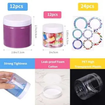 Show more If you're looking for the ultimate storage solution for your DIY crafting projects, look no further than these versatile plastic containers. Each package contains an impressive set of 12 large 6-ounce containers and 12 small 2-ounce ones, perfect for every need from storing glitter to your favorite homemade slime. Designed with a foam pad that ensures an airtight seal, these containers keep your crafts fresh and mess-free, whether you're on the go or storing them at home.