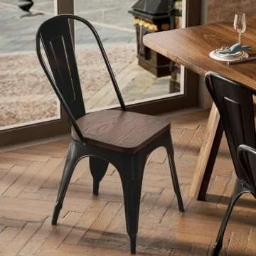 Shahoo Metal Dining Chairs Classic Iron Stackable Industrial Vintage Trattoria Wooden Seat and Back, Indoor-Outdoor Side Settee for Home Bistro Cafe Kitchen Restaurant Set of 4, Black and Gold