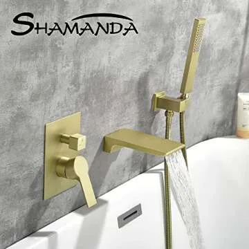 SHAMANDA Waterfall Wall Mounted Bathtub Faucet with Hand Shower, Bathroom Single Handle Tub Faucet Modern Brass Tub Shower Faucet Set(Including Rough-In Valve Body and Trim), Brushed Gold, L901-3