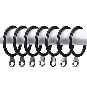 Show more Transform your living space with our exquisite black metal curtain rings, designed to elevate both functionality and style in your home. These premium curtain rings feature an outside diameter of approximately 37 mm (1.45 inch) and an inside diameter of 30 mm (1.18 inch), making them a perfect fit for curtain rods with a diameter of less than 27 mm (1.1 inch). Crafted from heavy-duty metal, each ring boasts a smooth and polished surface that ensures durability and ease of use.