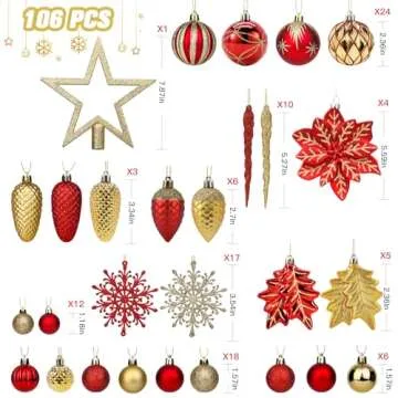 SHareconn 106PCS Christmas Balls Ornaments Set, Colorful Shatterproof Plastic Decorative Baubles for Xmas Tree Decor Holiday Wedding Party Decoration with Hanging Hooks, Red & Gold