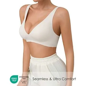 Show more Embrace unmatched comfort with our revolutionary wire-free seamless V-neck bra, designed to effortlessly adapt to your body while providing a luscious, second-skin feel. Crafted with a silky-soft material, this bra promises a smooth experience against your skin. The innovative 3D laser cut fabric ensures absolute invisibility under your clothing, allowing you to wear your favorite outfits without worry. The new silicone line support technique effectively eliminates the need for traditional underwires, offering you both comfort and necessary support without compromising on style.