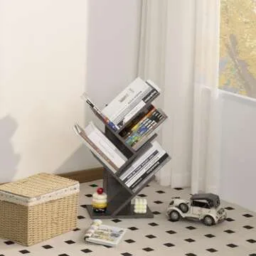 SHEEPAM 5 Tier Tree Book Shelf, Small Desktop Bookshelf with Storage Organizer, Wood Bookcase, Desk Display Bookshelves, Floor Standing Organizer Bookcases for Living Room,Bedroom,Office-Dark Grey