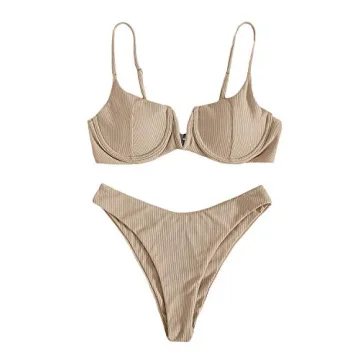 SheIn Women's 2 Piece Bikini Set Rib Knit Padded Underwire Bra and Briefs Swimsuit Apricot Large