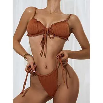 SheIn Women's 3 Piece Lettuce Trim Thong Bikini Set Swimsuit and Cover Up Beach Skirt Brown Small