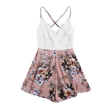 SheIn Women's Boho Crochet V Neck Halter Backless Floral Lace Romper Jumpsuit Pink Floral #4 Large