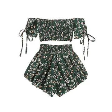 SheIn Women's Boho Floral Two Piece Outfit Off Shoulder Drawstring Crop Top and Shorts Set Medium Dark Green
