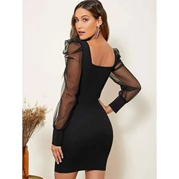 SheIn Women's Elegant Scoop Neck Sheer Long Sleeve Stretch Bodycon Mini Dress