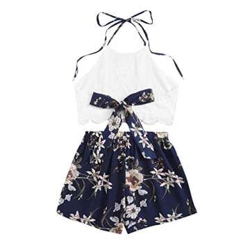 SheIn Women's Floral Twopiece Sleeveless Halter Lace Cami Crop Top and Short Set Dark Blue Flower Small