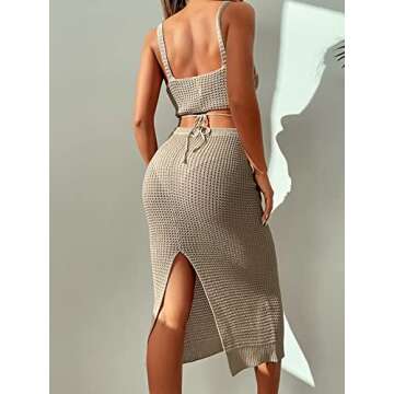 SheIn Women's Knitted Cover Up Set Two Pieces Sleeveless Tank Crop Top and Split Tie Back High Waist Midi Skirt Khaki Small