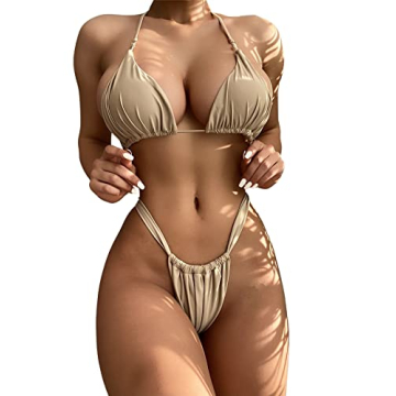 SheIn Women's Sexy Ruched Triangle Bikini with Thong - Khaki