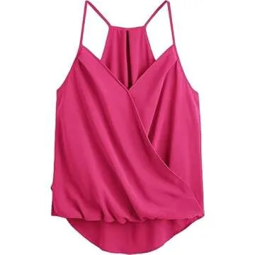 Introducing the SheIn Women's Sleeveless Twist Front Wrap Cami Tank Top, a trendy and chic addition to any woman's summer wardrobe! Crafted from high-quality, breathable fabric, this stylish hot pink cami tank features a sophisticated twist front design that offers a flattering silhouette for all body types. The spaghetti straps and lightweight material make it perfect for staying cool, while the lovely shade of hot pink adds a vibrant pop of color that brightens up any outfit.