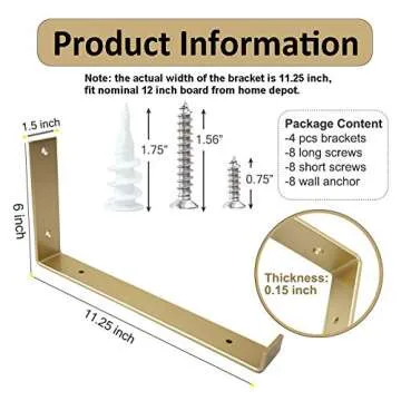 Show moreTransform your home with our Shelf Brackets 12 Inch 4PCS Heavy Duty Gold Wall Bracket, designed specifically for floating shelves. Crafted from high-quality iron, these brackets boast impressive durability and can support a maximum load of 110LB per pair, making them ideal for all your heavy-duty shelving needs. Each bracket is finished with a stunning frosted gold coat that not only enhances their aesthetic appeal but also protects them from scratches during transport. Perfect for a rustic or modern decor, these brackets will seamlessly blend into your home while providing exceptional functionality.