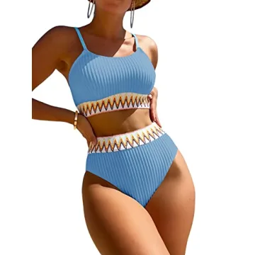 Show moreIntroducing the SHENHE Women's 2 Piece High Waist Bikini Set in a stunning light blue that is sure to elevate your swimwear collection! This beautifully designed swimsuit features a modern geometric print and a ribbed texture that not only enhances your curves but also provides supreme comfort. Made from high-quality stretchy material, this bikini set is smooth, breathable, and gentle on the skin, making it ideal for long days at the beach or by the pool. The spaghetti straps and scoop neck add a chic touch, while the removable padding ensures you can customize your fit for maximum confidence.