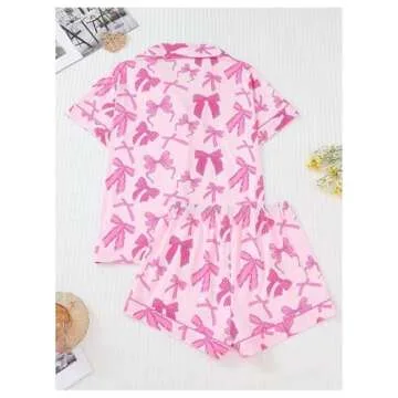 Features: 2 piece pajama sets for women, button down, collared neck, short sleeve, graphic, bow, elastic waist, mini shorts, shorts pajama sets for women