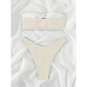Show moreIntroducing the SHENHE Women's 2 Piece Ruched O Ring Bathing Suit, a perfect combination of style and comfort that will make waves at the beach or by the poolside. Crafted with high-quality materials, this textured beige bikini set not only flatters your figure but also offers durability that lasts swim after swim. The chic bandeau top features a unique ruched design accentuated by an eye-catching O-ring detail, while the high-cut bottoms provide the perfect balance of coverage and allure. This swimsuit is designed for those who want to embrace their body with confidence and style.