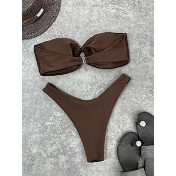 Show more Introducing the SHENHE Women's 2 Piece Strapless O Ring High Cut Bandeau Swimsuit Bathing Suit Bikini Sets, an essential addition to your summer wardrobe. Crafted from comfy and high-stretch material, this bikini set is both breathable and skin-friendly, promising maximum comfort while you soak up the sun. The alluring chocolate brown shade complements various skin tones, making it a versatile choice for all swim enthusiasts. Designed with style in mind, this swimsuit features a two-piece textured design, an O linked ring detail, and a sophisticated strapless silhouette that highlights your natural curves beautifully without compromising on support.