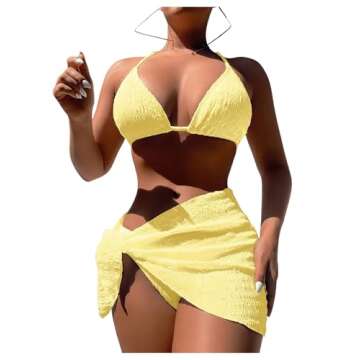 SHENHE Women's 3 Piece Textured High Cut Halter Triangle Bikini Swimsuit with Cover Up Yellow Plain S