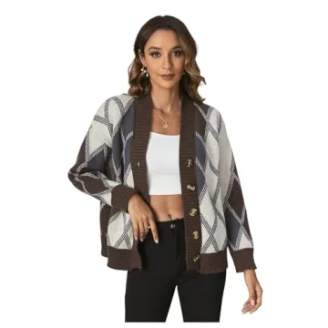 SHENHE Women's Cardigan Argyle Sweater Plaid Long Sleeve Button Down Preppy Knit Outerwear Coffee Brown Large