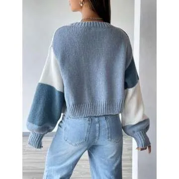 SHENHE Women's Color Block Cardigan Open Front Long Sleeve Knit Cropped Sweater Blue M