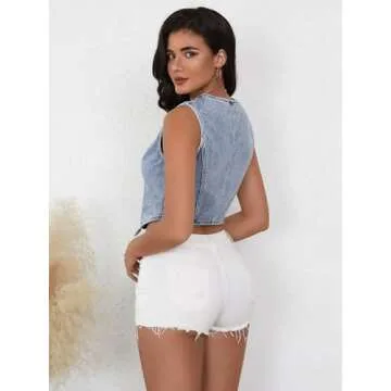 Show more Introducing the perfect blend of style and comfort, this denim vest for women is a must-have addition to your wardrobe. Designed to elevate any outfit, it features a button front, a v neck cut, and a chic cropped style that complements both casual and dressy looks. Whether worn solo or layered over a classic tee or blouse, this vest is your go-to for versatile styling. The asymmetrical hem adds a modern twist, ensuring you stand out with every wear.
