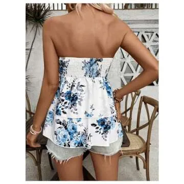 SHENHE Women's Floral Print Strapless Smocked Tube Tiered Ruffle Hem Flowy Boho Tube Top Blue and White Medium