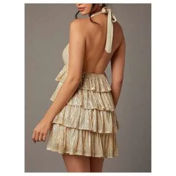 SHENHE Women's Glitter Sequin Halter Dress Deep V Backless Sparkle Party Night Flapper Dress Champagne Small