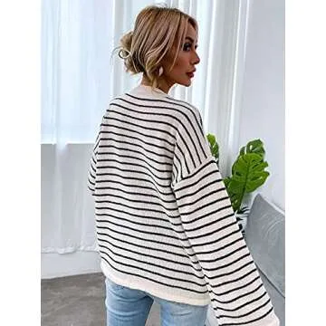 Show moreIntroducing the SHENHE Women's Striped Long Sleeve Button Up Ribbed Knit Oversized Sweater Tops, a stylish and versatile addition to your wardrobe that perfectly blends comfort and elegance. This sweater is designed in a chic allover striped print and features a classic round neck that lends a timeless appeal. The lightweight, stretchy fabric is not only skin-friendly but also ensures you stay cozy without feeling restricted. Complete with a button-up front and drop shoulder design, this oversized knitwear embraces a loose fit, enhancing your silhouette while allowing for easy layering throughout the seasons. Whether dressing up for work or down for casual outings, this sweater adapts to any occasion seamlessly.