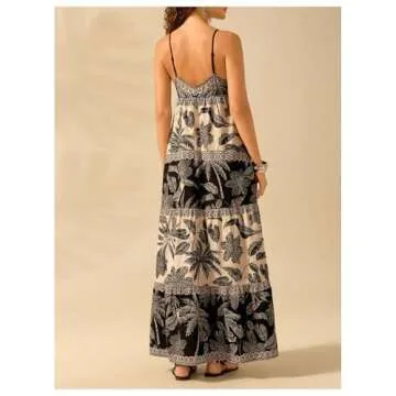 SHENHE Women's Summer Tropical Maxi Sundress Tiered Ruffle Hem Spaghetti Strap Boho Dresses Black and White Small