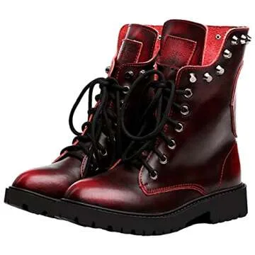 Show moreStep into a world of bold style with the Shenn Women's Round Toe Mid Calf Punk Military Combat Boots. These eye-catching combat boots are not just footwear; they are a statement. The rich wine red hue adds a touch of individuality to your wardrobe, while the mid-calf design ensures versatility in pairing with various outfits. Crafted for comfort and support, these boots feature a round toe and sturdy construction, making them perfect for both casual outings and more adventurous endeavors.