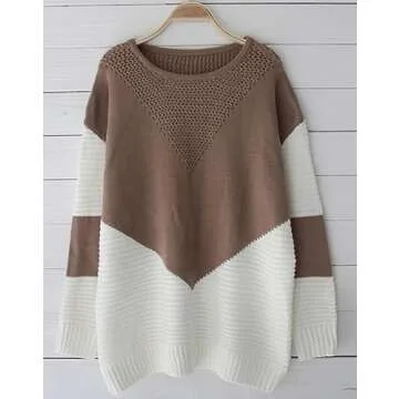 Shermie Women's V Shape Colorblock Sweaters Long Sleeve Crew Neck Loose Casual Knitted Pullover Small Camel