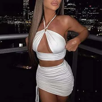 SHESEEWORLD Women's Sexy Hollow Out 2 Piece Outfits Halter Neck Sleeveless Crop Top and Drawstring Ruched Bodycon Skirt Sets