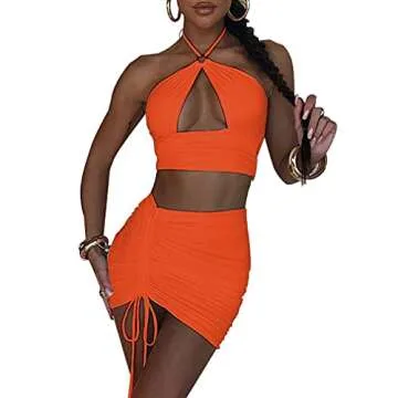 SHESEEWORLD Women's Sexy Hollow Out 2 Piece Outfits Halter Neck Sleeveless Crop Top and Drawstring Ruched Bodycon Skirt Sets